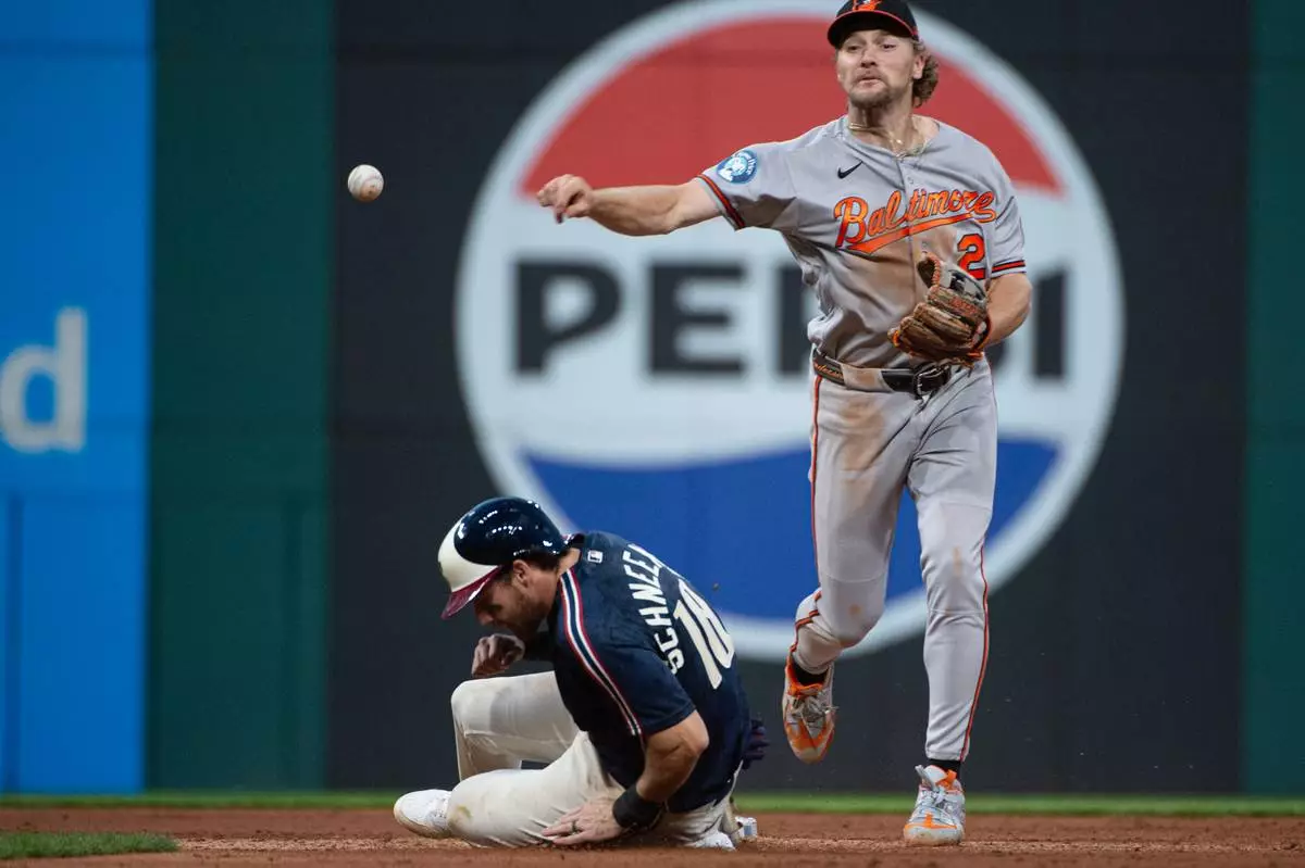 Baltimore Orioles' Gunnar Henderson, right, forces Cleveland Guardians' Daniel Schneemann, left, at second base but his throw to first was not in time for a double play during the sixth inning of a baseball game, Friday, April 17, 2026, in Cleveland. (AP Photo/Phil Long)