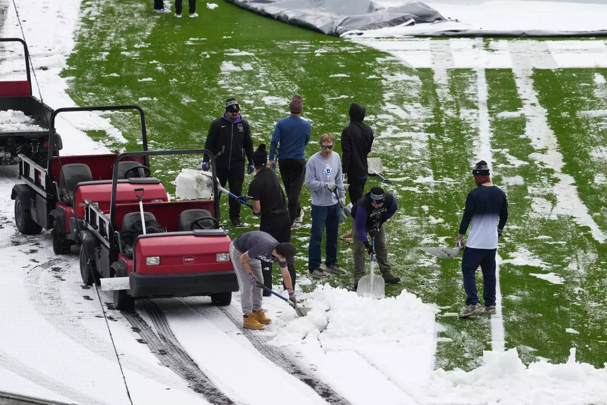 Grounds crew members toil to clear snow from the outfield of Coors Field after a spring storm blanketed the intermountain West before the Colorado Rockies host the Los Angeles Dodgers in a baseball game Friday, April 17, 2026, in Denver. (AP Photo/David Zalubowski)