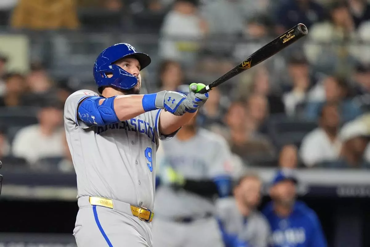 Kansas City Royals' Vinnie Pasquantino hits a home run during the eighth inning of a baseball game against the New York Yankees Friday, April 17, 2026, in New York. (AP Photo/Frank Franklin II)