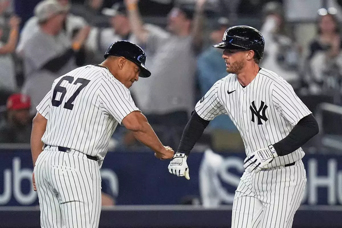 New York Yankees' Ryan McMahon, right, celebrates with third base coach Luis Rojas as he runs the bases after hitting a two-run home run during the eighth inning of a baseball game against the Kansas City Royals Friday, April 17, 2026, in New York. (AP Photo/Frank Franklin II)