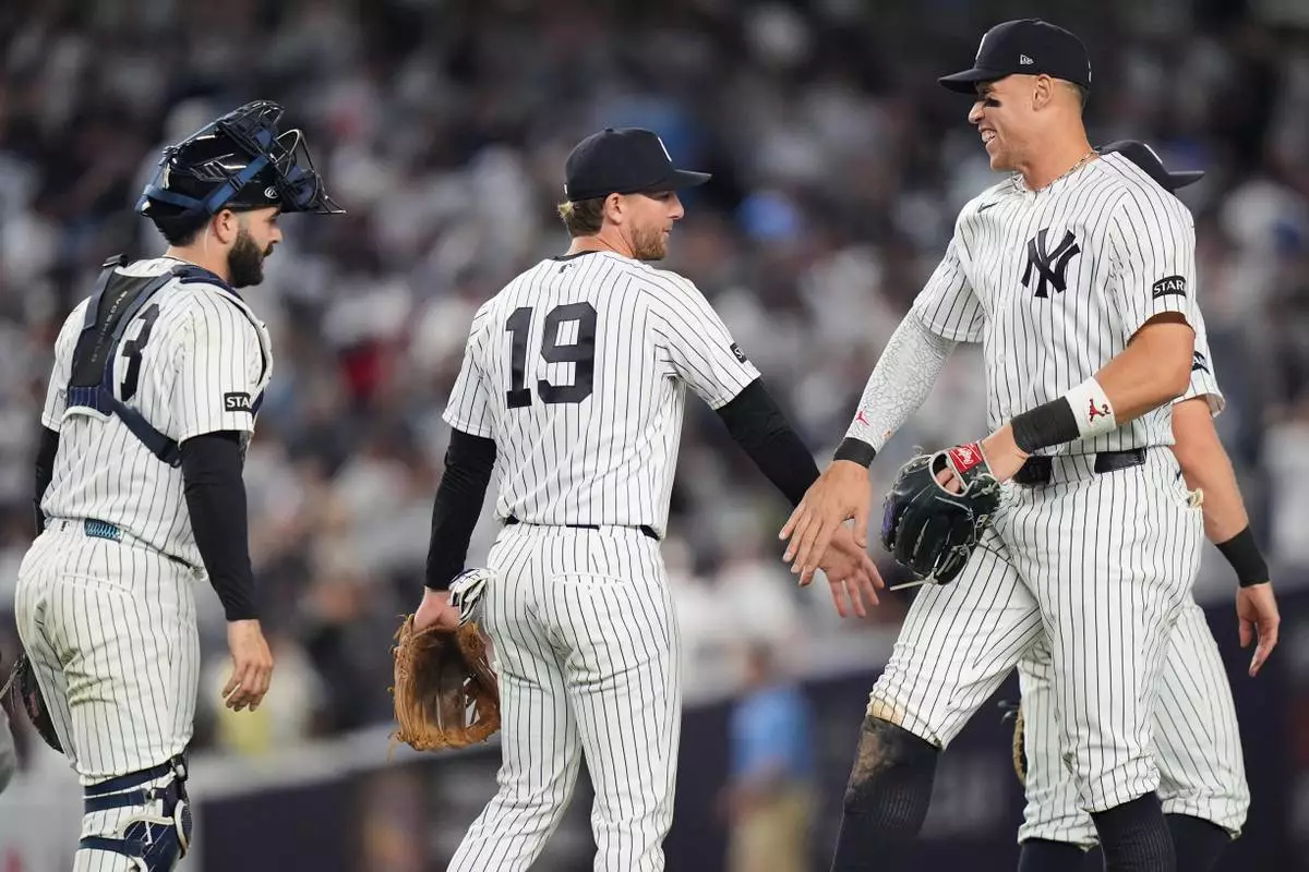 New York Yankees' Aaron Judge, right, celebrates with Ryan McMahon, center, and Austin Wells after a baseball game against the Kansas City Royals Friday, April 17, 2026, in New York. (AP Photo/Frank Franklin II)