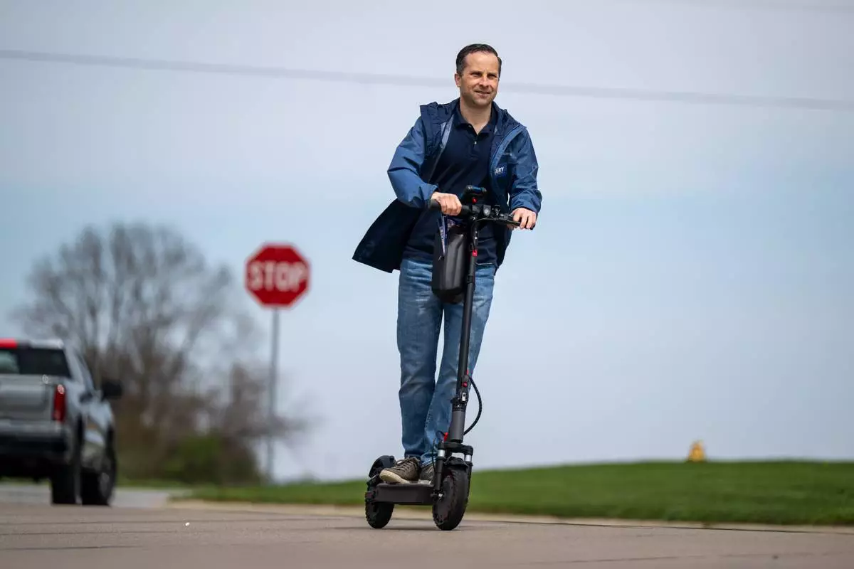Indiana state Sen. Spencer Deery, R-West Lafayette, who represents District 23, canvasses a neighborhood on an electric scooter, Saturday, April 11, 2026, in West Lafayette, Ind. (AP Photo/Doug McSchooler)