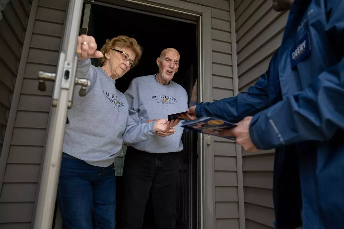 Retired couple Annette Williams, and her husband, Curtis Williams, speak with Indiana state Sen. Spencer Deery, R-West Lafayette, who represents District 23, after he stops at their home while canvassing a neighborhood, Saturday, April 11, 2026, in West Lafayette, Ind. (AP Photo/Doug McSchooler)