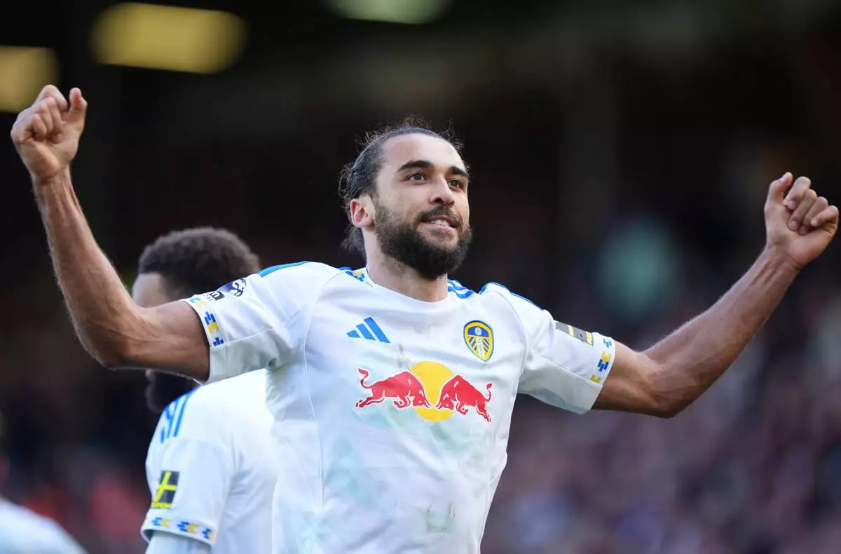 Leeds United's Dominic Calvert-Lewin celebrates after scoring their third goal of the game from the penalty spot during the English Premier League soccer match between Leeds United and Wolverhampton Wanderers, Saturday April 18, 2026, in Leeds, England. (Mike Egerton/PA via AP)