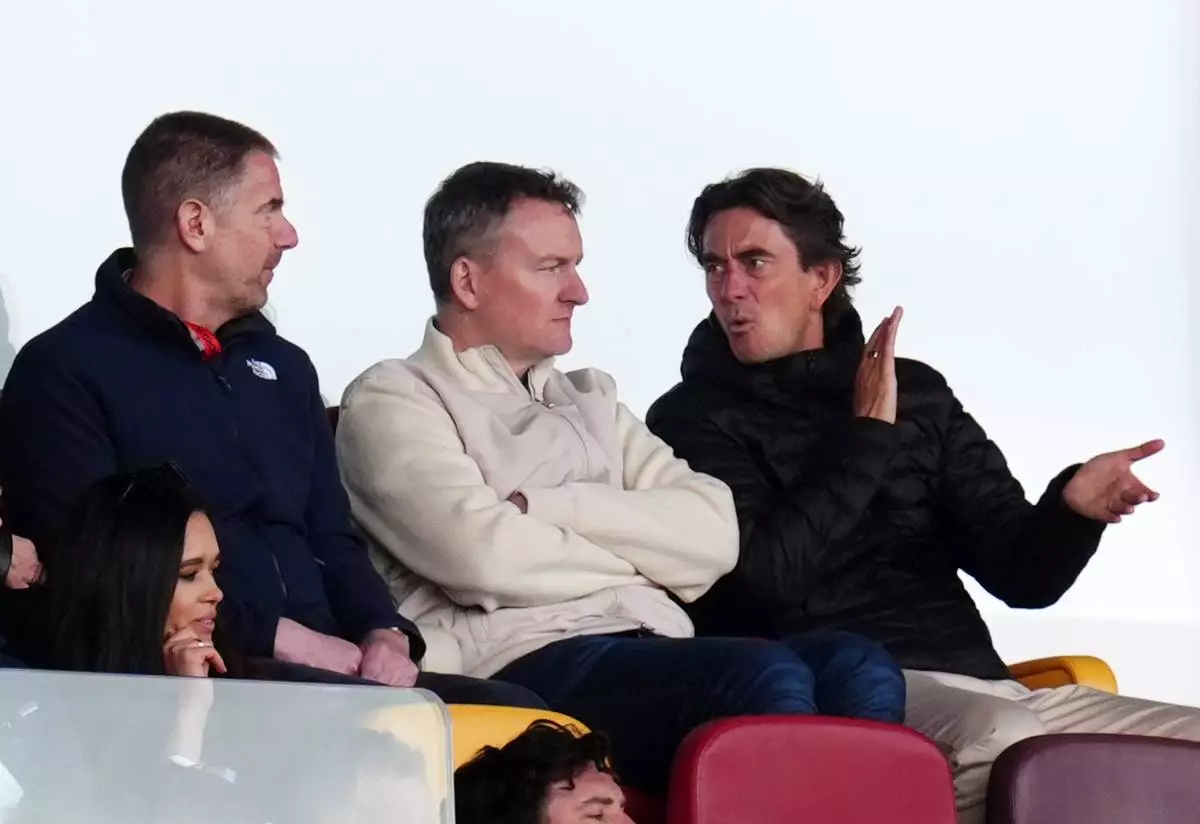 Former Brentford and Tottenham manger Thomas Frank in the stands during the English Premier League soccer match between Brentford and Fulham in Brentford, England, Saturday, April 18, 2026. (John Walton/PA via AP)