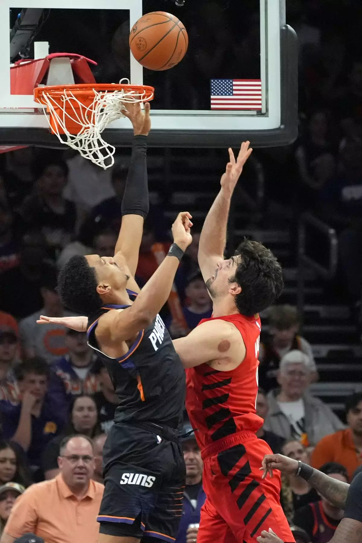 Portland Trail Blazers forward Deni Avdija, right, scores against Phoenix Suns forward Ryan Dunn, left, during the second half of an NBA play-in tournament basketball game, Tuesday, April 14, 2026, in Phoenix. (AP Photo/Ross D. Franklin)