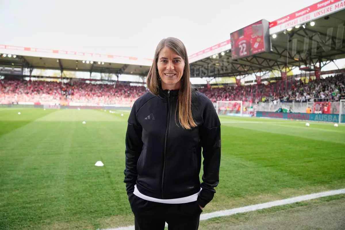 New head coach of German Bundesliga soccer club 1. FC Union Berlin Marie-Louise Eta looks on during the warm up prior to the German Bundesliga soccer match between FC Union Berlin and Wolfsburg in Berlin, Germany, Saturday, April 18, 2026. (AP Photo/Ebrahim Noroozi)