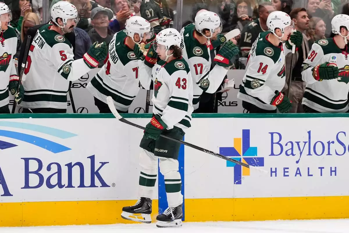 Minnesota Wild defenseman Quinn Hughes (43) celebrates with the team after scoring against the Dallas Stars in the first period of an NHL hockey game Thursday, April 9, 2026, in Arlington, Texas. (AP Photo/Tony Gutierrez)