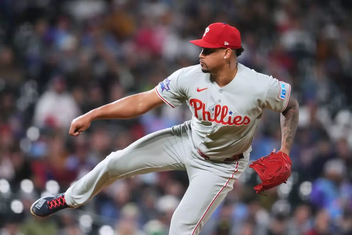iPhiladelphia Phillies relief pitcher Jhoan Duran works against the Colorado Rockies n the ninth inning of a baseball game Saturday, April 4, 2026, in Denver. (AP Photo/David Zalubowski)
