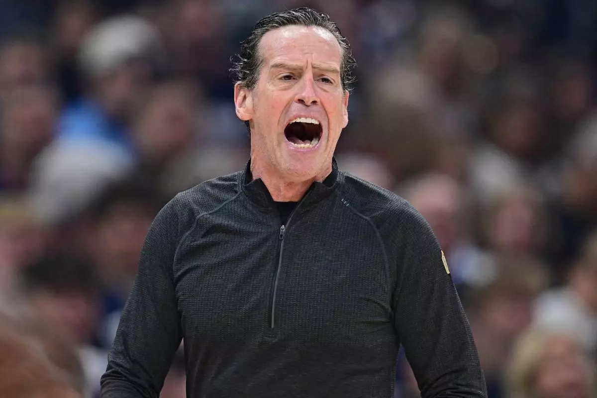 Cleveland Cavaliers head coach Kenny Atkinson shouts during the first half in Game 1 of a first-round NBA playoffs basketball series against the Toronto Raptors, Saturday, April 18, 2026, In Cleveland. (AP Photo/David Dermer)
