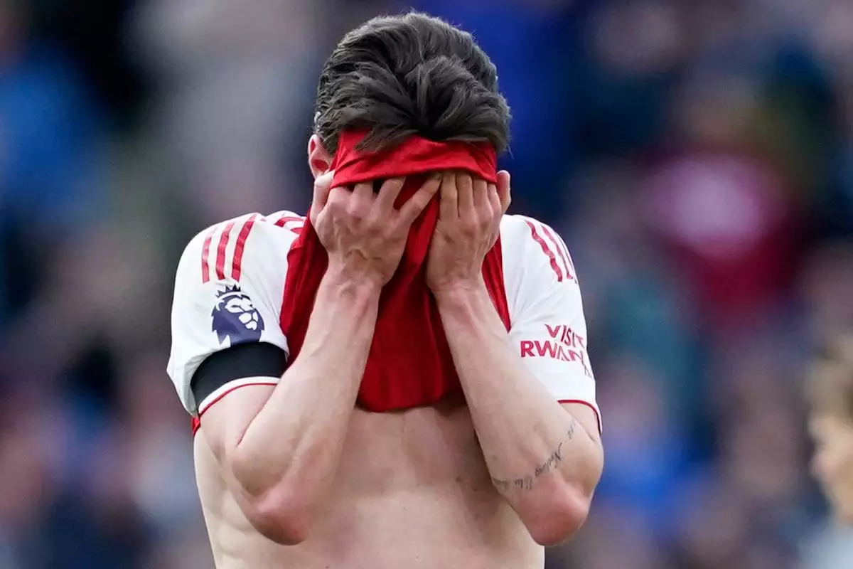 Arsenal's Declan Rice reacts at the end of the English Premier League soccer match between Manchester City and and Arsenal, in Manchester, England, Sunday, April 19, 2026. (AP Photo/Dave Thompson)