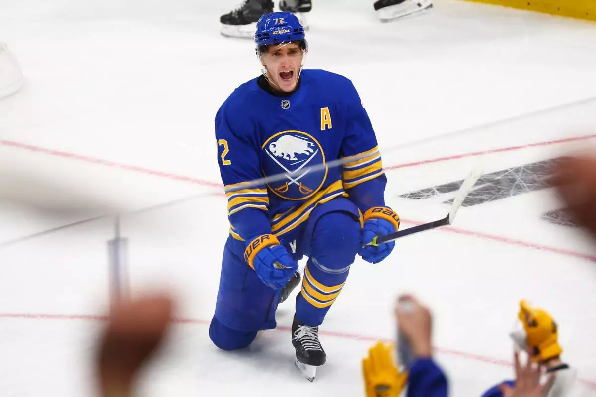 Buffalo Sabres center Tage Thompson (72) celebrates his goal during the third period in Game 1 of a first-round NHL hockey Stanley Cup playoff series against the Boston Bruins, Sunday, April 19, 2026, in Buffalo, N.Y. (AP Photo/Jeffrey T. Barnes)