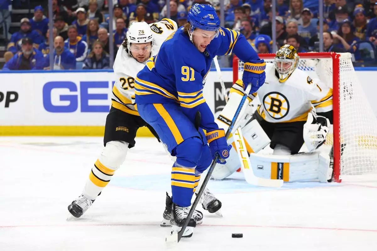 Buffalo Sabres right wing Josh Doan (91) carries the puck past Boston Bruins defenseman Andrew Peeke (26) during the first period in Game 1 of a first-round NHL hockey Stanley Cup playoff series Sunday, April 19, 2026, in Buffalo, N.Y. (AP Photo/Jeffrey T. Barnes)