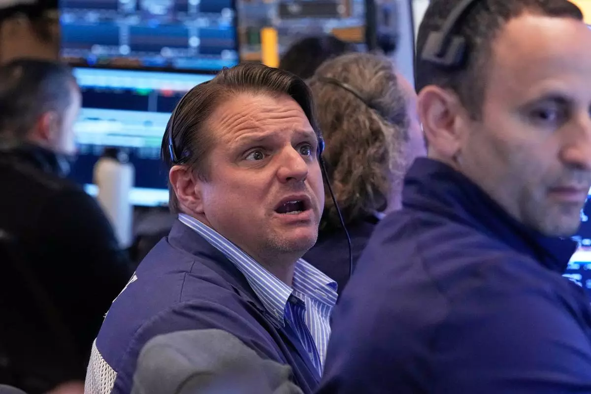 Trader Michael Milano, left, works on the floor of the New York Stock Exchange, Monday, April 20, 2026. (AP Photo/Richard Drew)