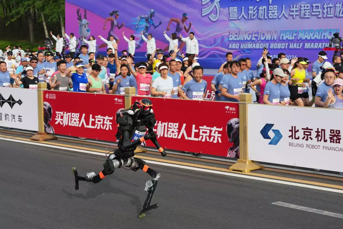 A robot starts off for the Beijing E-Town Half Marathon and Humanoid Half Marathon on the outskirts of Beijing on Sunday, April 19, 2026. (AP Photo/Ng Han Guan)