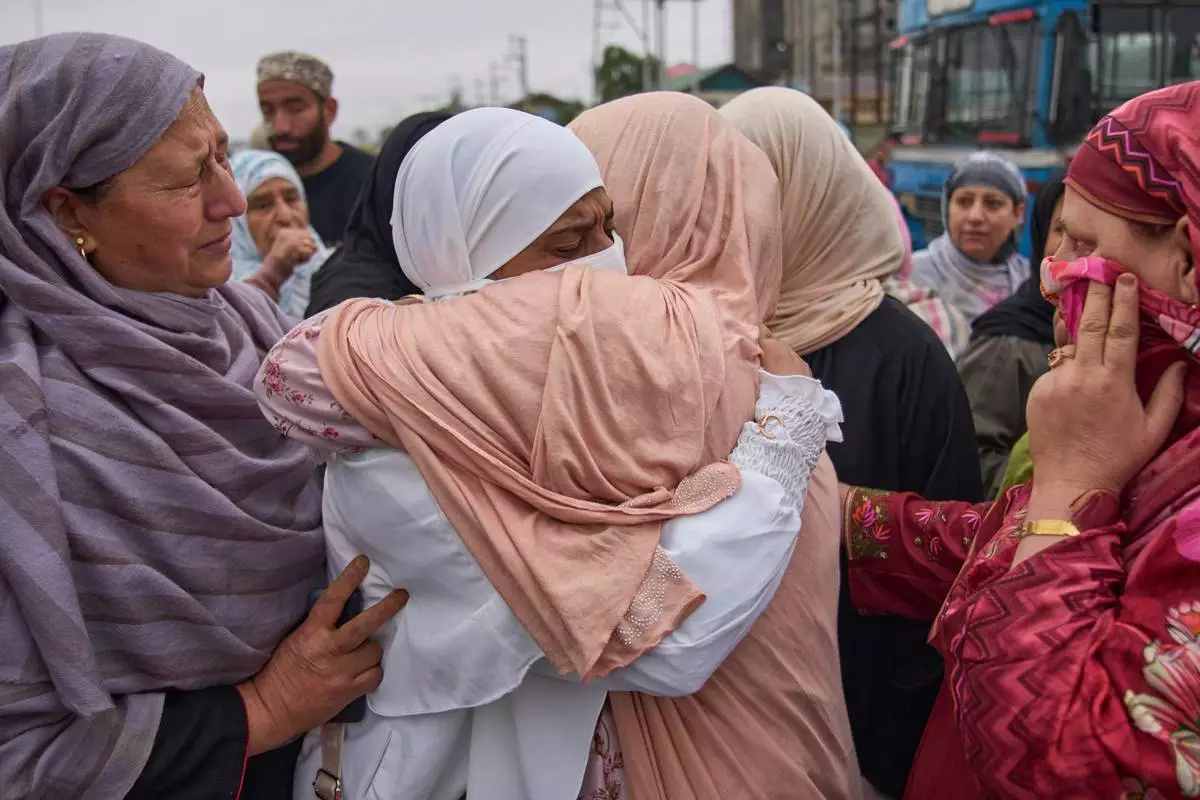 A Kashmiri Muslim pilgrim, in white, is given a farewell hug by her relative as she leaves for the annual hajj pilgrimage to the holy city of Mecca, in Srinagar, Indian-controlled Kashmir, Saturday, April 18, 2026. (AP Photo/Dar Yasin)