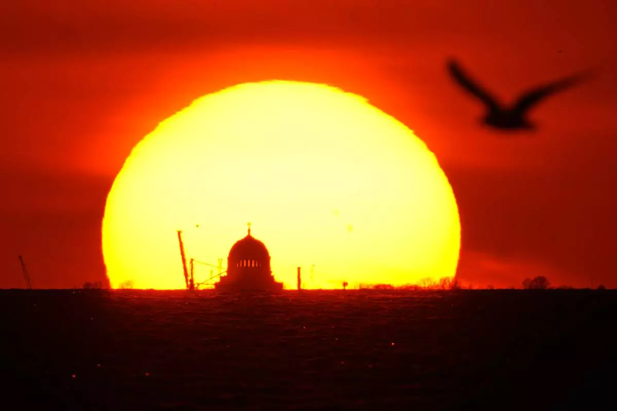 The sun sets behind St. Nicholas Naval Cathedral located on Kronstadt Island in the Gulf of Finland, outside St. Petersburg, Russia, Sunday, April 19, 2026. (AP Photo/Dmitri Lovetsky)
