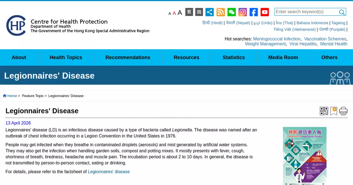The Centre for Health Protection (CHP) of the Department of Health (DH) today (April 20) reported the latest number of Legionnaires' disease (LD) cases, and reminded the public of the importance of using and maintaining properly designed man-made water systems, adding that susceptible groups should strictly observe relevant precautions.