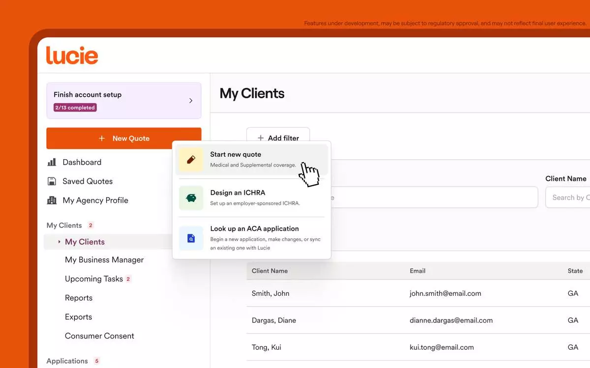 Lucie instantly quotes, enrolls and renews products across carriers. Lucie delivers what consumers and brokers need: 94% of U.S. workers want more insurance choices and 93% are satisfied after switching to the individual market. 1 Brokers can sign clients up in minutes to upgrade the consumer healthcare experience.