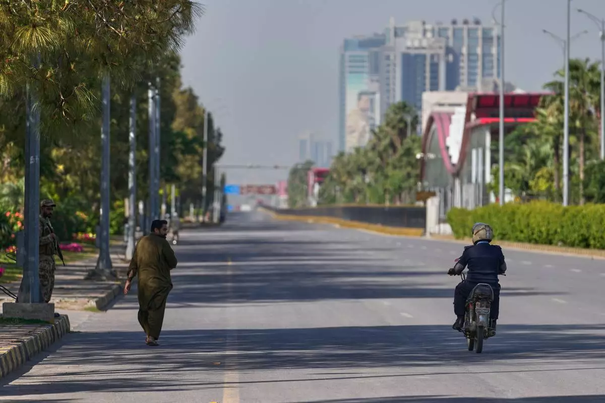 An army soldier, left, walks as police officer drives motorcycle on an empty road ahead of second round of negotiations between the U.S. and Iran, in Islamabad, Pakistan, Monday, April 20, 2026. (AP Photo/Anjum Naveed)