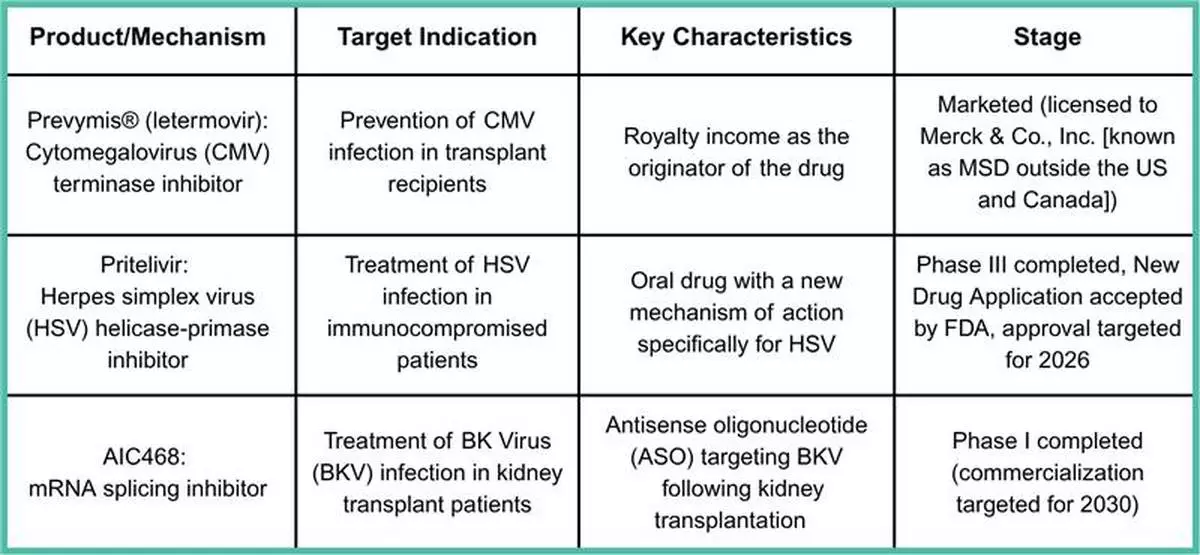 Aicuris adds three antiviral assets spanning marketed and clinical-stage development, complementing Asahi Kasei’s existing treatment portfolio. This includes a consistent royalty stream from Prevymis®; a near-term commercial opportunity with pritelivir, for which the U.S. Food and Drug Administration (FDA) granted Priority Review to the New Drug Application, with a Prescription Drug User Fee Act (PDUFA) target date in the fourth quarter of 2026; and AIC468 as a longer-term growth driver.