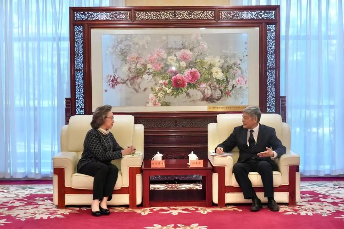 A delegation of Permanent Secretaries and Heads of Departments of the Hong Kong Special Administrative Region Government for a national affairs study officially commenced their programme today (April 20) at the National Academy of Governance (NAG). Photo shows the Secretary for the Civil Service, Mrs Ingrid Yeung (left), called on the Executive Vice President of NAG in charge of daily operations, Mr Xie Chuntao (right).Source: HKSAR Government Press Releases