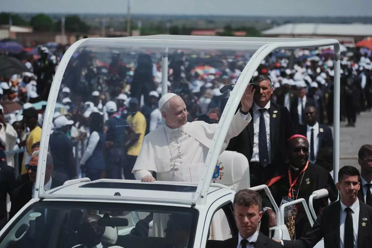 Pope Leo XIV is cheered by faithful as he arrives to celebrate a mass at Saurimo esplanade, Angola, Monday, April 20, 2026. (AP Photo/Andrew Medichini)
