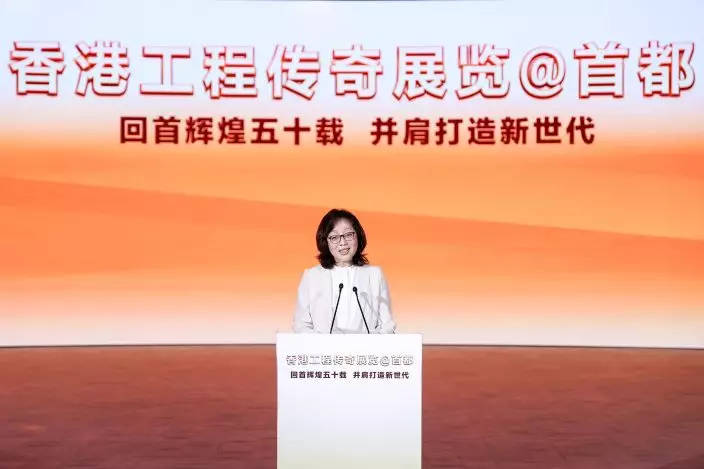 The Secretary for Development, Ms Bernadette Linn, today (April 20) attended the "Hong Kong Engineering Legacy Exhibition@Capital" organised by the Hong Kong Institution of Engineers in celebration of its 50th anniversary in Beijing. Photo shows Ms Linn delivering a speech at the launching ceremony. Source: HKSAR Government Press Releases