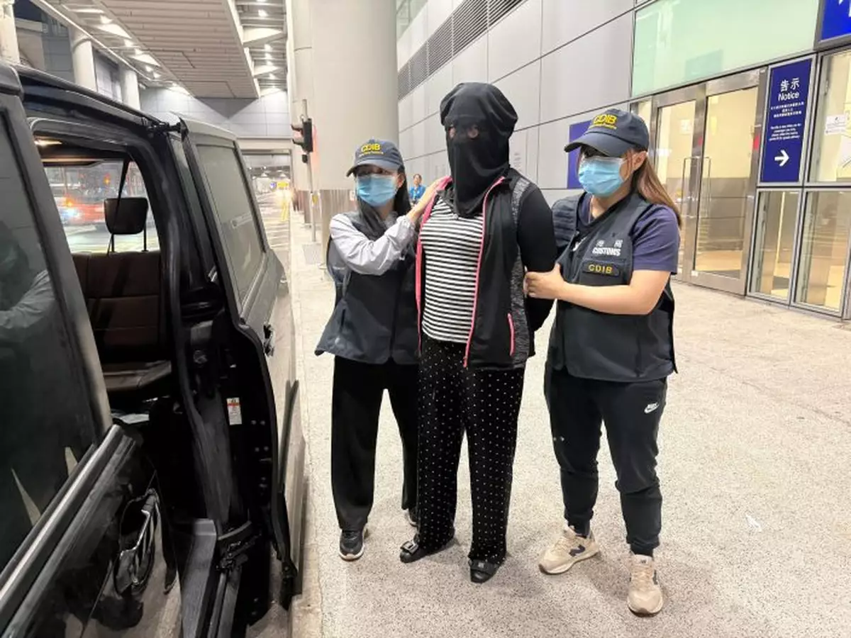 Hong Kong Customs today (April 20) seized about 10 kilograms of suspected cannabis buds with an estimated market value of about $2 million at Hong Kong International Airport. One woman was arrested. Photo shows the arrested woman (centre). Source: HKSAR Government Press Releases