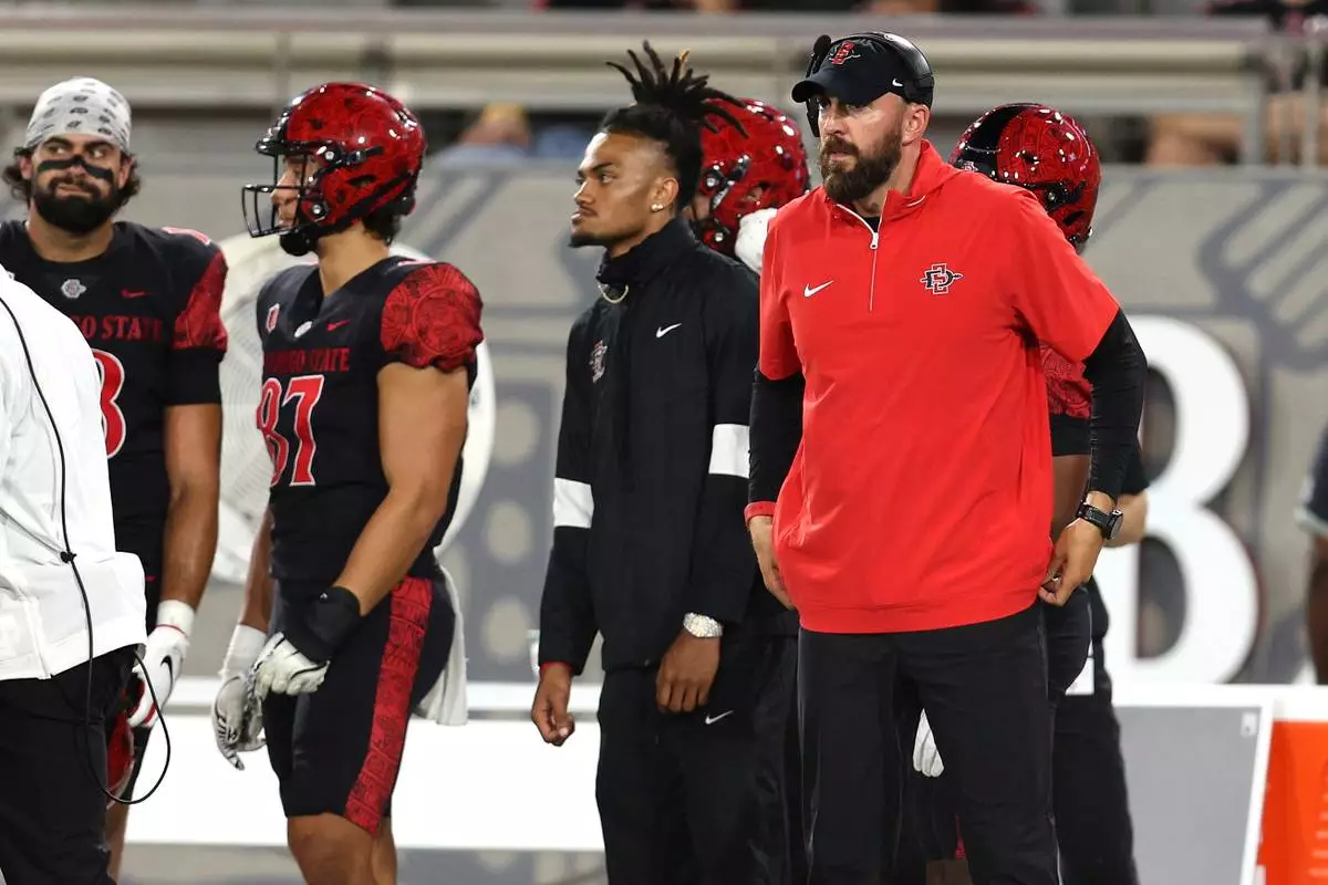 FILE - San Diego State head coach Sean Lewis, right, looks on during the first half of an NCAA college football game against Oregon State, Sept. 7, 2024, in San Diego. (AP Photo/Raul Romero Jr., File)