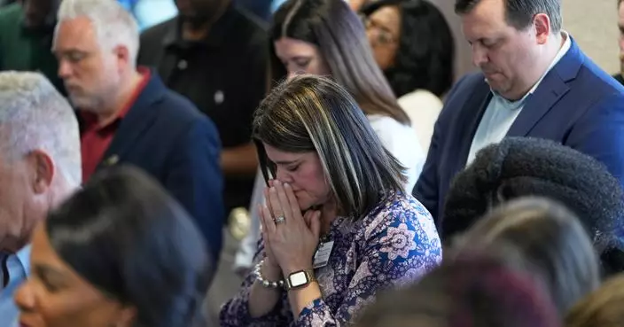 Attendees pray at the conclusion of a news conference about the children killed during a mass shooting the day before in Shreveport, La., Monday, April 20, 2026. (AP Photo/Gerald Herbert)