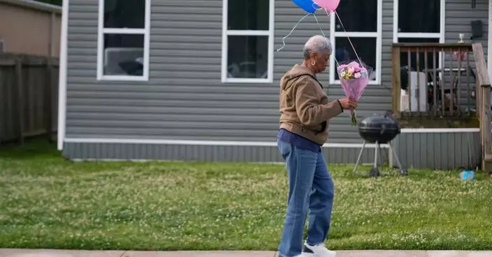 A woman walks to leave flowers and balloons on the front lawn of the home where children were killed during a mass shooting the day before in Shreveport, La., Monday, April 20, 2026. (AP Photo/Gerald Herbert)
