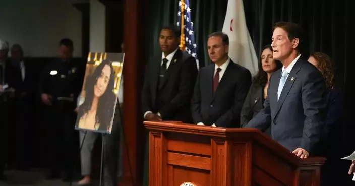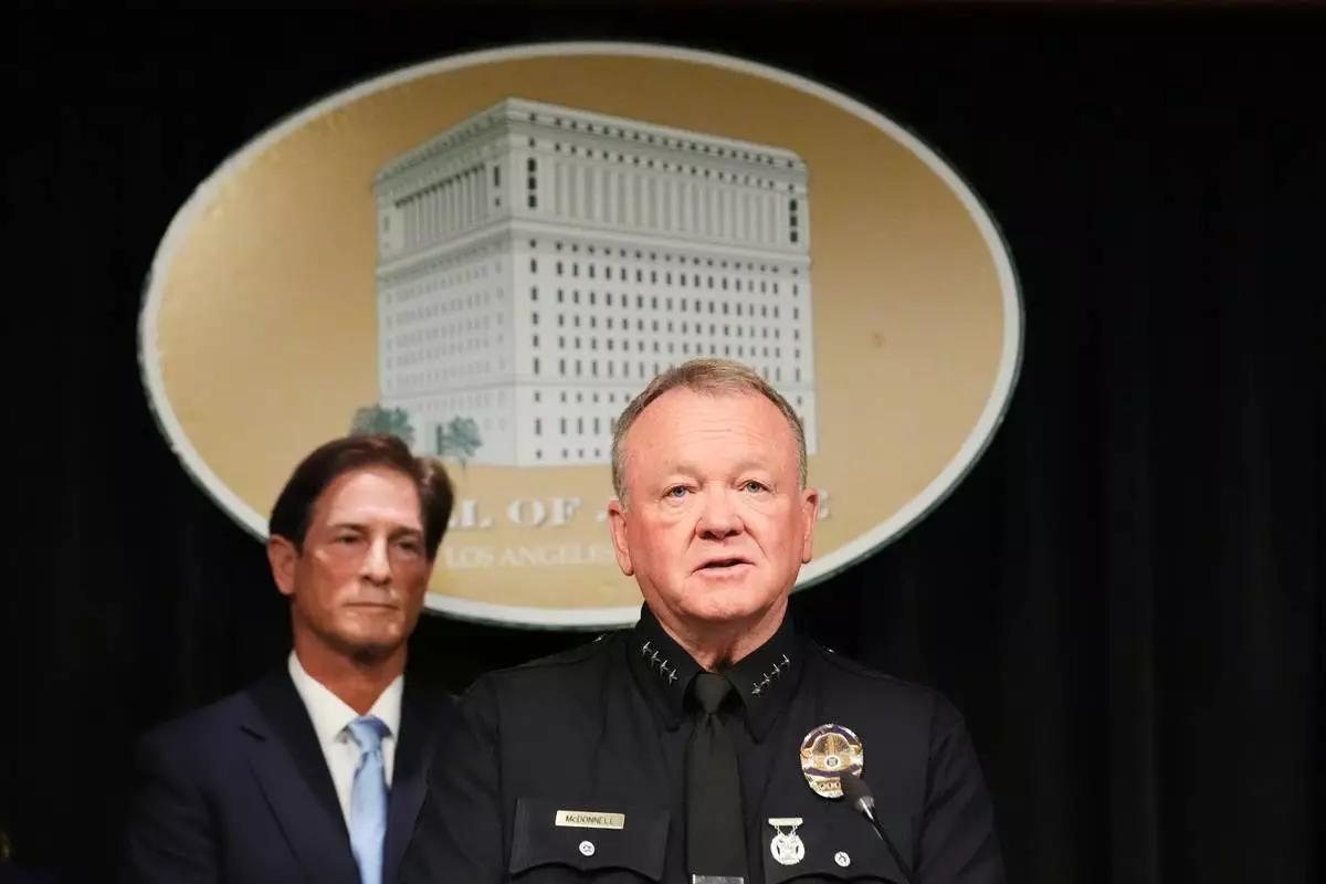 LAPD Chief Jim McDonnell speaks Monday, April 20, 2026, in Los Angeles regarding the case of singer D4vd, who was charged on suspicion of killing a 14-year-old girl whose dismembered body was found in his car. (AP Photo/Damian Dovarganes)