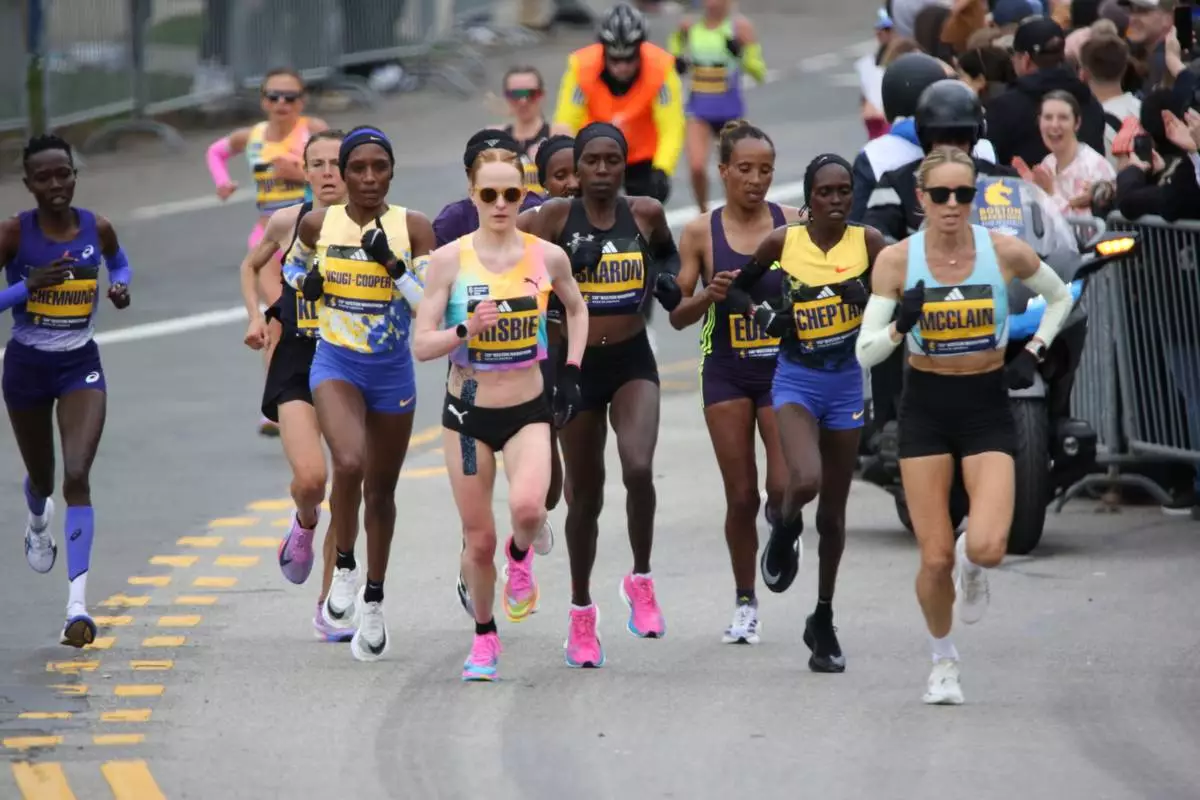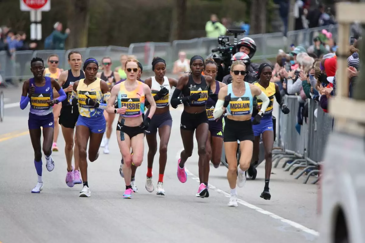 Jess McClain, right, runs in the lead pack on the Boston Marathon course in Newton, Mass., on Monday, April 20, 2026. (AP Photo/Jennifer McDermott)
