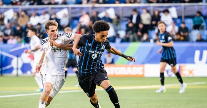 Real Madrid's Daniel Yanez, left, and Club Brugge's Andre Garcia, right, challenge for the ball during the Youth League final soccer match between Club Brugge and Real Madrid in Lausanne, Switzerland, Monday, April 20, 2026. (Jean-Christophe Bott/Keystone via AP)