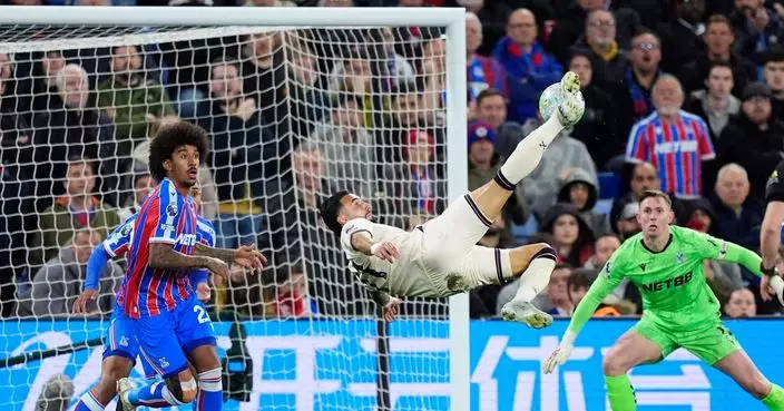 West Ham United's Taty Castellanos tries an overhead kick during the English Premier League soccer match between Crystal Palace and West Ham United in London, England, Monday, April 20, 2026. (Jordan Pettitt/PA via AP)