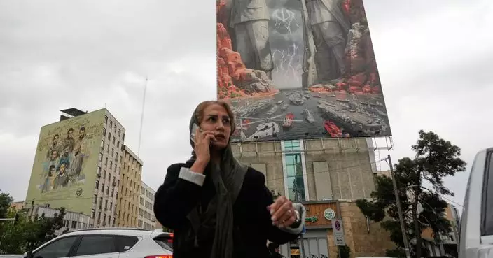 A woman talks on her cellphone as she walks past a billboard showing Rais Ali Delvari, a national hero in an early 1900 uprising against British forces in southern Iran in the Persian Gulf, right, and the late Revolutionary Guard's navy chief Alireza Tangsiri, who was killed in the U.S.-Israeli strike in late March 2026, commanding the closure of the Strait of Hormuz, on a building at a square in downtown Tehran, Iran, Monday, April 20, 2026. (AP Photo/Vahid Salemi)