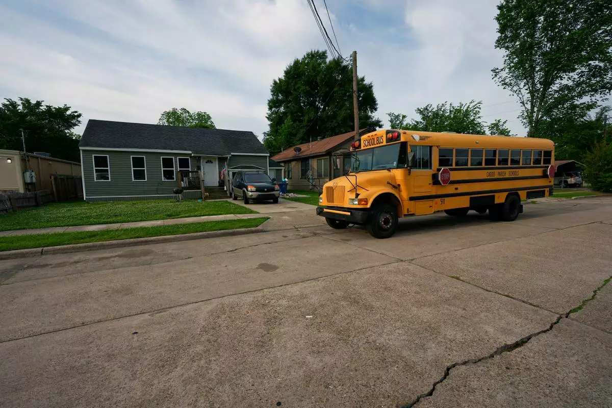 A school bus passes the house where 8 children were killed during a mass shooting the day before in Shreveport, La., Monday, April 20, 2026. (AP Photo/Gerald Herbert)