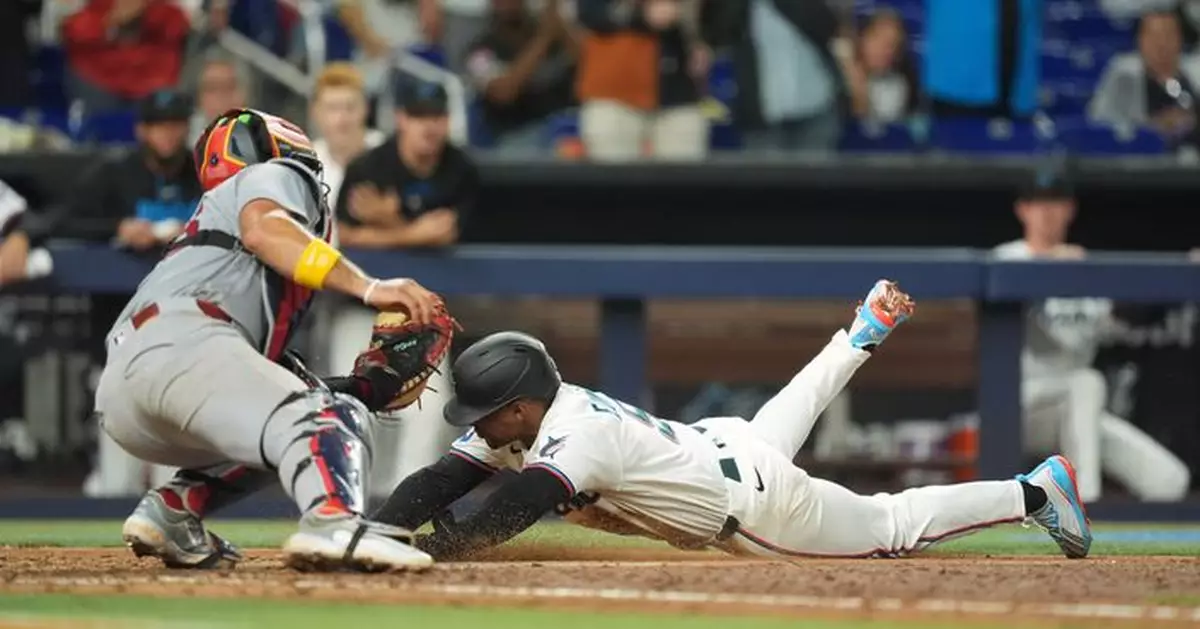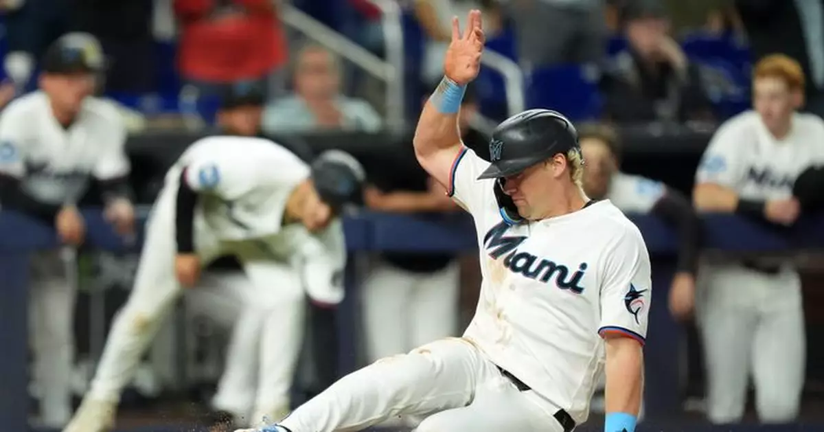 Miami Marlins' Kyle Stowers slides home to score on a double by Otto Lopez during the sixth inning of a baseball game against the St. Louis Cardinals, Monday, April 20, 2026, in Miami. (AP Photo/Rebecca Blackwell)