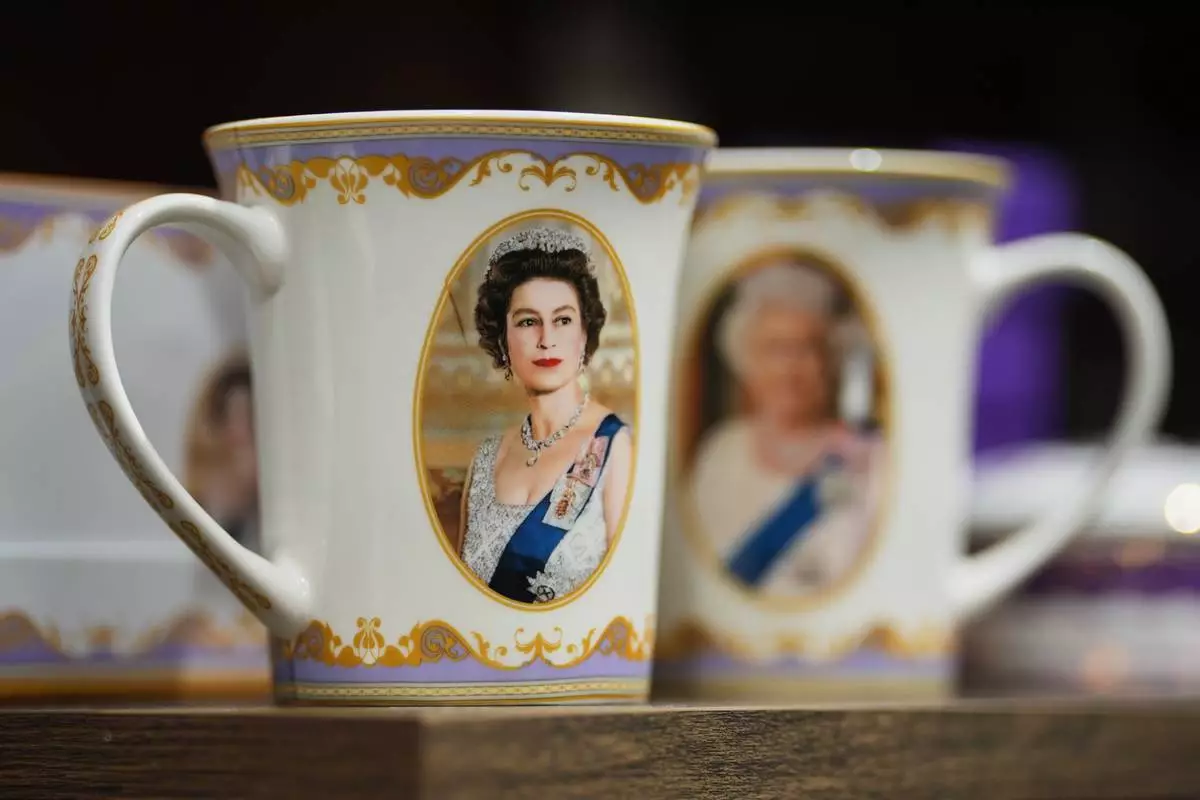 Mugs with photos of late Queen Elizabeth II are on display for sale at a souvenirs shop in London, on April 17, 2026. (AP Photo/Kin Cheung)