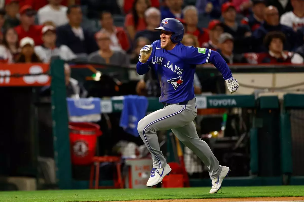 Toronto Blue Jays' Myles Straw (3) runs to home plate to score during the seventh inning of a baseball game against the Los Angeles Angels, Monday, April 20, 2026, in Anaheim, Calif. (AP Photo/Caroline Brehman)