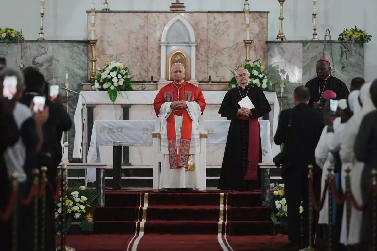 Pope Leo XIV arrives at the Parish of Our Lady of Fatima in Luanda, Angola, for a meeting with bishops, priests, consecrated men and women, and pastoral workers Monday, April 20, 2026, on the eighth day of an 11-day apostolic journey to Africa (AP Photo/Andrew Medichini)