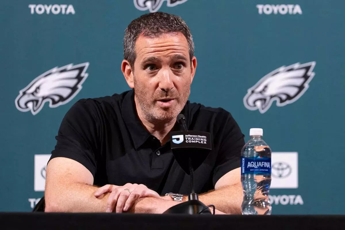 Philadelphia Eagles executive vice president and general manager Howie Roseman speaks with the media during a news conference at the NFL football team's training facility, Tuesday, April 14, 2026, in Philadelphia. (AP Photo/Chris Szagola)