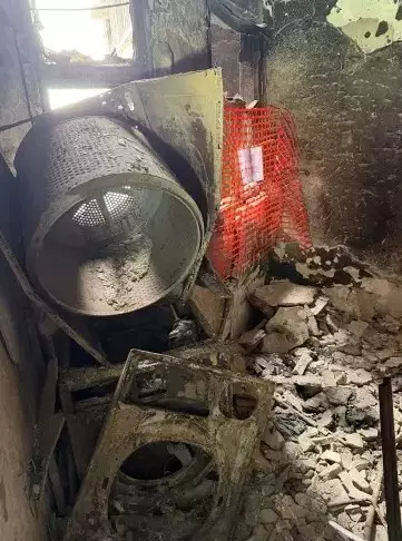 Ronnie described the damage to her unit as severe, with many things burned to ashes. The interior was filled with dust, and many items were burned down, so the suitcase she brought to carry her belongings today could barely hold anything except the teapot set. She said, "Even the bicycle was burned and warped." The bathroom sink was also badly burned and stuck to the wall. However, she noted that there were no mosquitoes or bugs in the unit, and it was well-ventilated. As for today, she wore waterproof boots to avoid being injured by wood splinters, and she thanked the volunteers for bringing a shovel and a light to assist her.