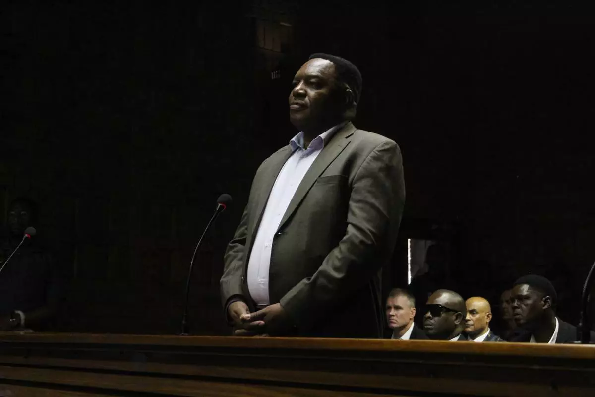South Africa's national police commissioner Fannie Masemola appears in the Pretoria Magistrates Court in Pretoria, South Africa, Tuesday, April 21, 2026. (AP Photo/ Mogomotsi Magome)