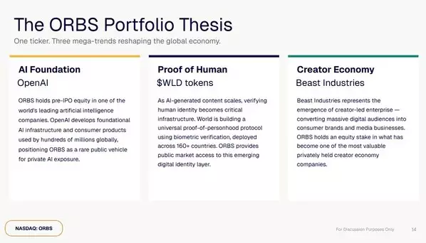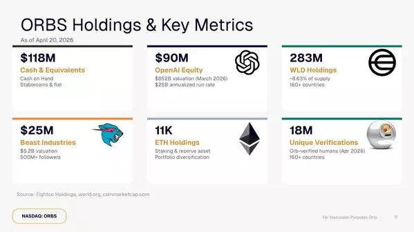 As of April 20, 2026, at 5:00 p.m. ET, ORBS' holdings include a $90 million investment in OpenAI, a $25 million investment in Beast Industries, 283,452,700 Worldcoin (WLD) at $0.27 per WLD (per Coinbase), 11,068 Ethereum (ETH coins), and $118 million in total cash and stablecoins, for total holdings of approximately $336 million.