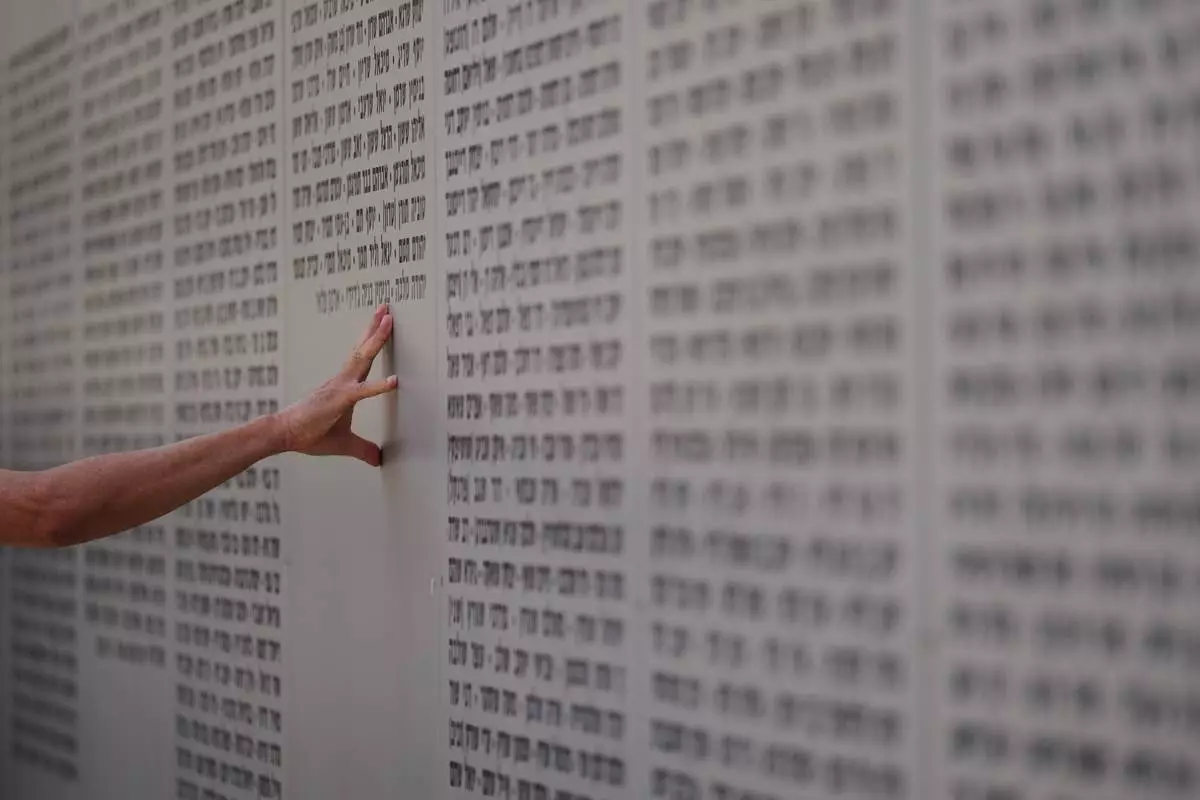 A man touches the wall with names of fallen soldiers during Israel's annual Memorial Day for the soldiers who died in the nation's conflicts and victims of nationalistic attacks at the Armored Corps memorial site in Latrun, Israel, Tuesday, April 21, 2026. (AP Photo/Ariel Schalit)