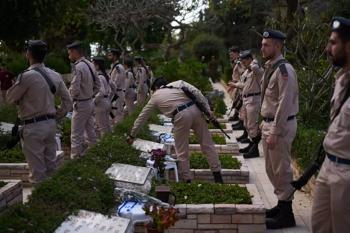 Israeli soldiers place flags and flowers on graves at a military cemetery ahead of the annual Memorial Day honoring fallen soldiers and victims of nationalistic attacks in Tel Aviv, Israel, Monday, April 20, 2026. (AP Photo/Oded Balilty)