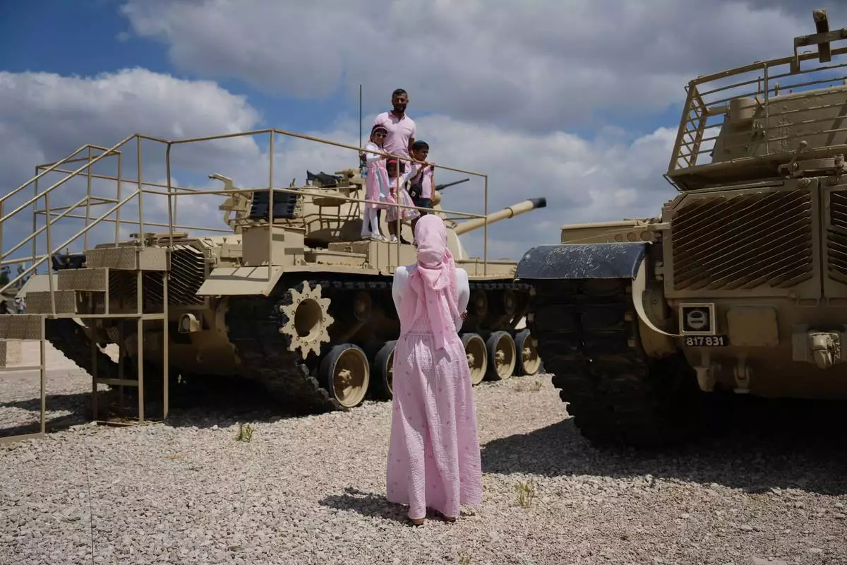 People take their photos on old tanks at the Armored Corps memorial site during a ceremony marking Israel's annual Memorial Day for the soldiers who died in the nation's conflicts and victims of nationalistic attacks, in Latrun, Israel, Tuesday, April 21, 2026. (AP Photo/Ariel Schalit)