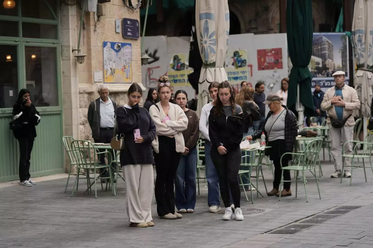 People stand still to observe two minutes of silence as air raid sirens sound, marking Israel's annual Memorial Day for the soldiers who died in the nation's conflicts and victims of nationalistic attacks, in Jerusalem, Tuesday, April 21, 2026. (AP Photo/Mahmoud illean)